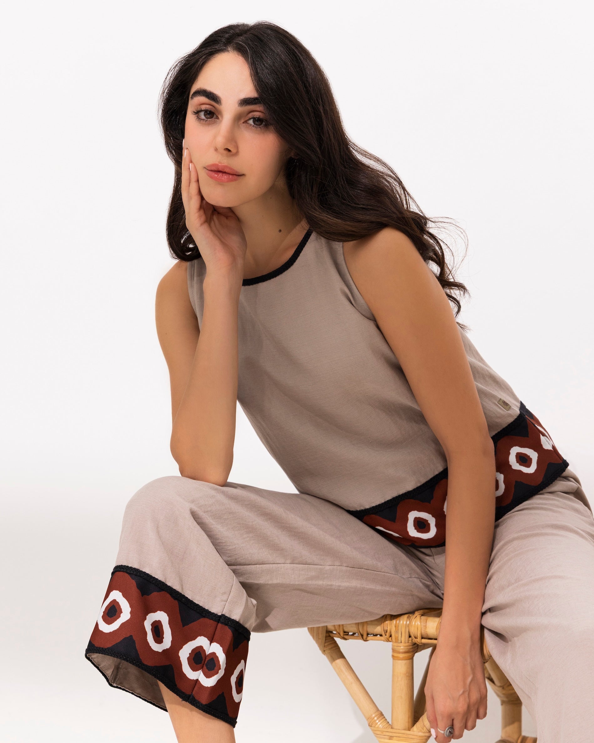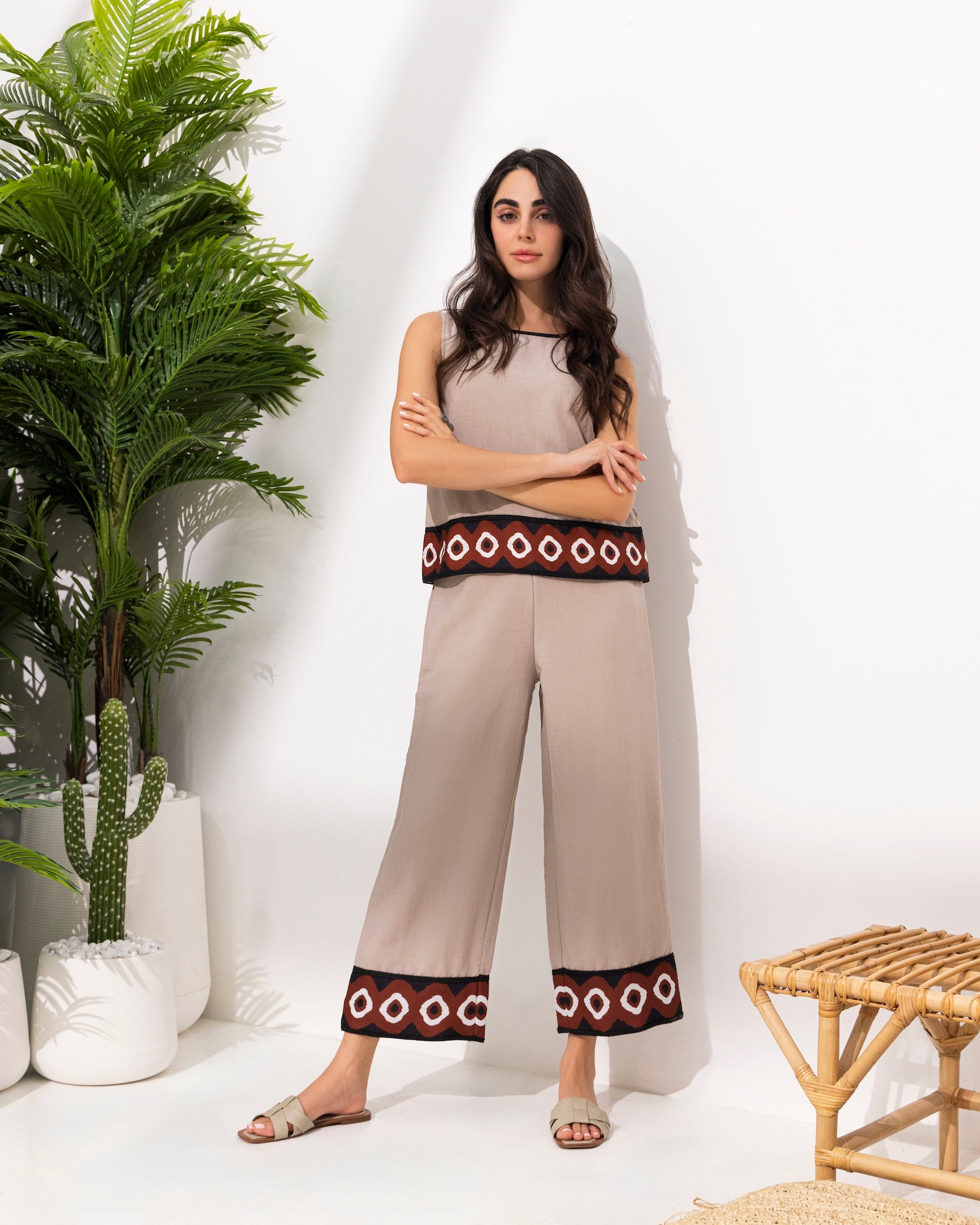 Minimal and sleeveless, The Sana'a Set blends clean lines with the classic Mughmaq pattern — a timeless Yemeni design reimagined in soft neutral tones.