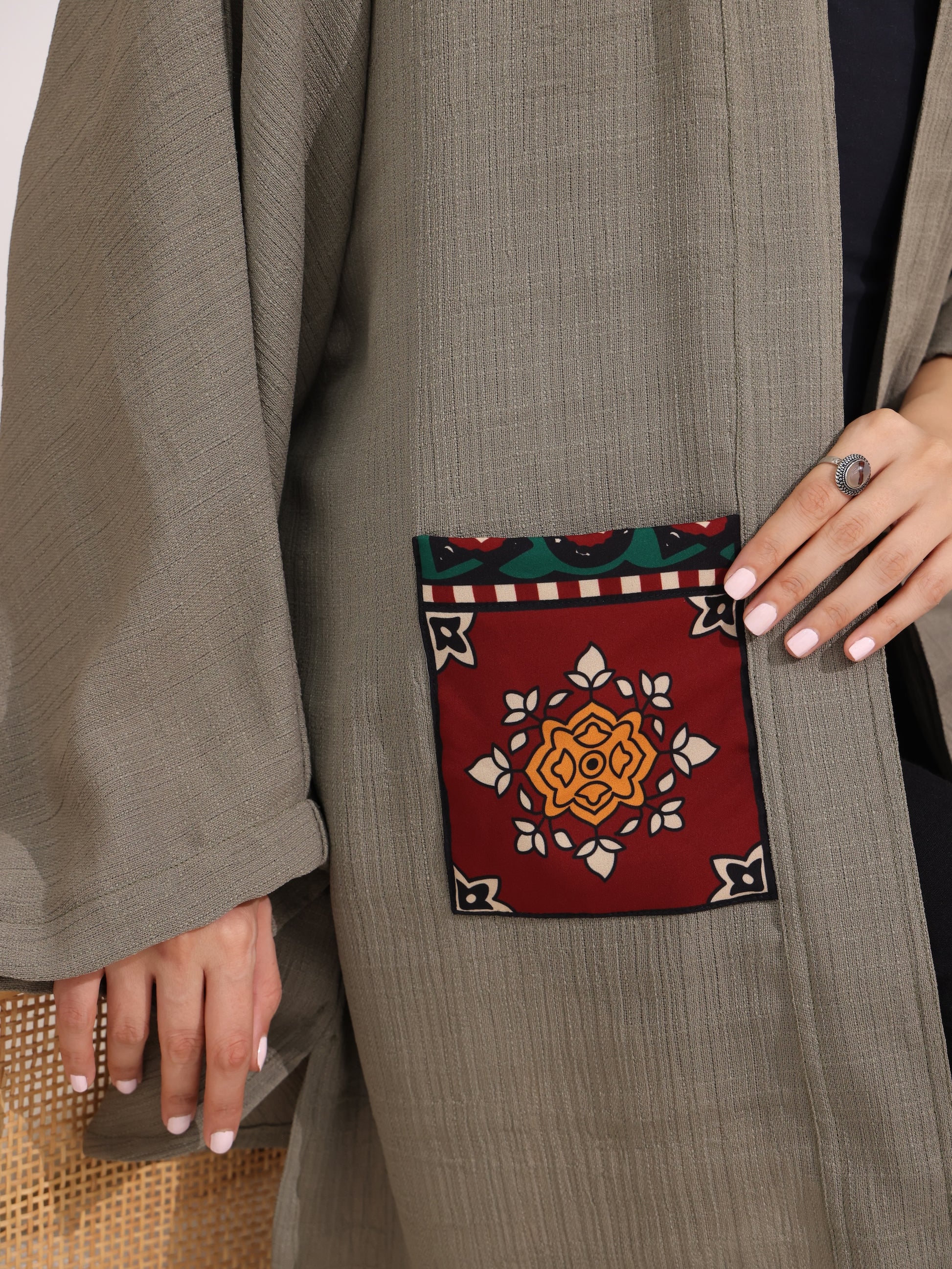 A loose-fit kimono jacket with wide sleeves and a statement embroidered patch pocket for heritage detail.