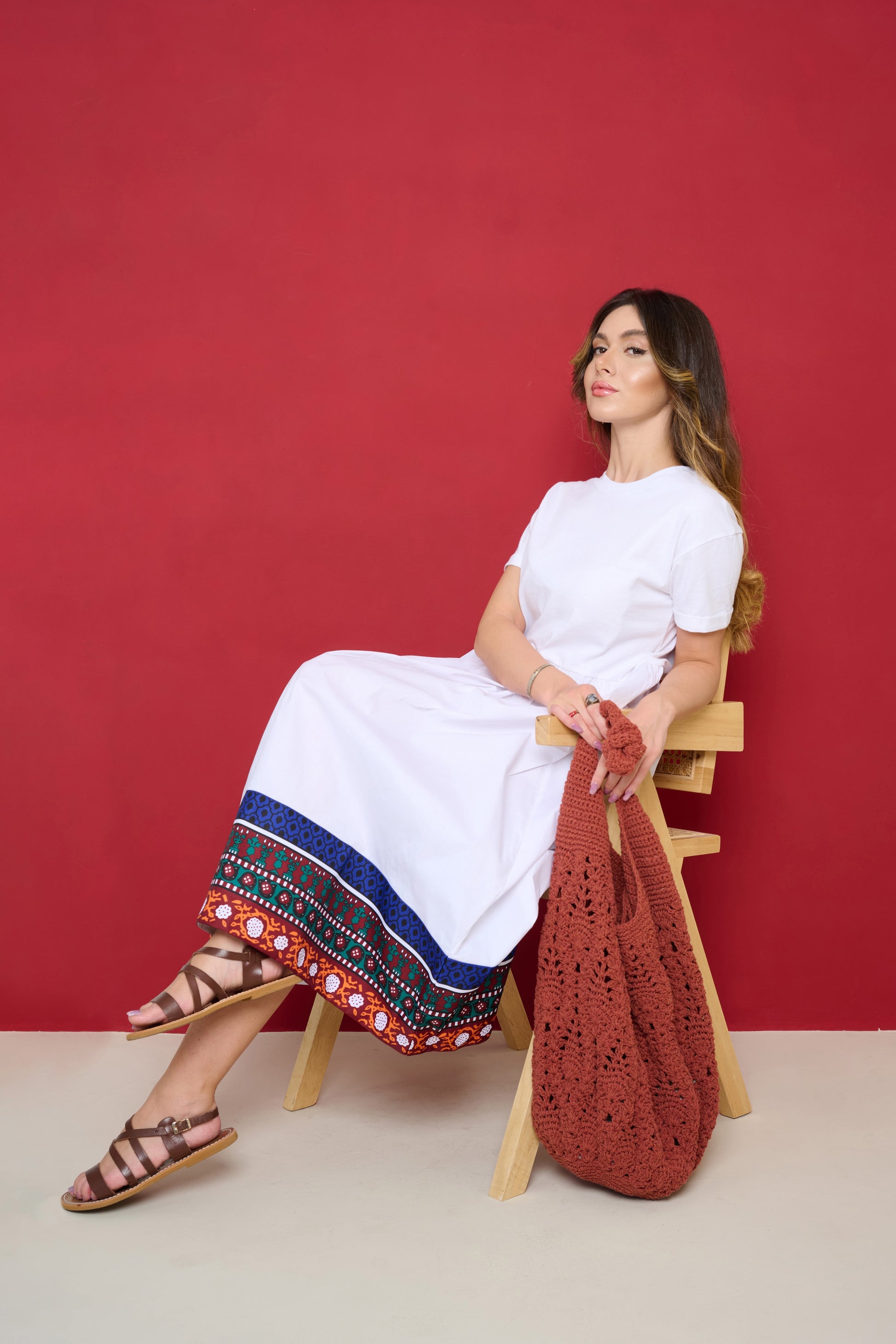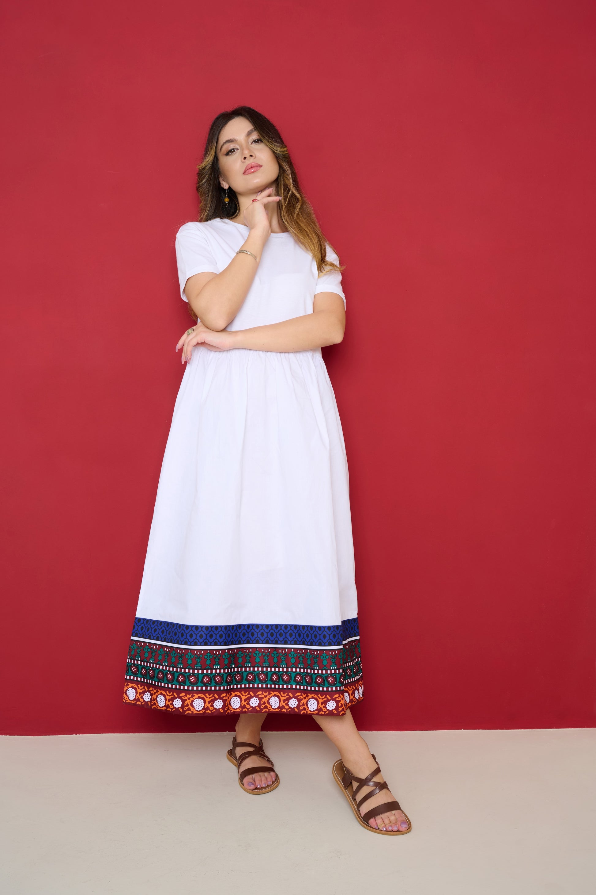 Full-length 100% cotton dress with a fitted bodice and a wide hem embroidered in traditional Yemeni patterns.