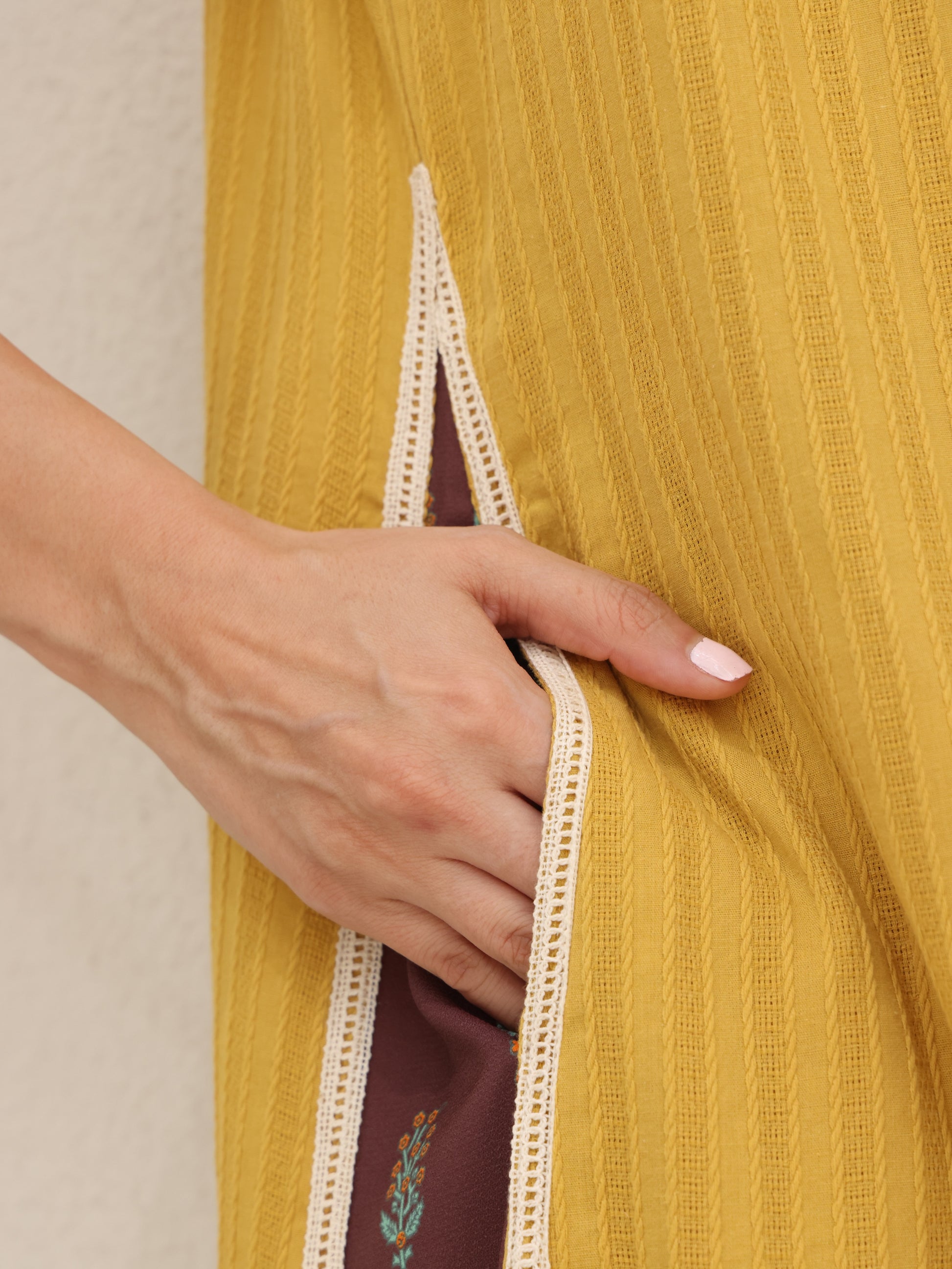 A sleeveless A-line midi dress in mustard yellow with contrasting printed side panels for a flowing, easy fit.